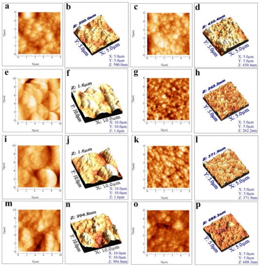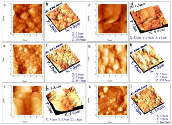 The 5 µm × 5 µm 2D and 3D AFM micrographs recorded on the six specimens obtained at 80 °C using the novel electrodeposition method are presented in Figure 5, while those scanned on the six samples deposited at 90 °C using the same method are displayed in Figure 6. Table S1 (see the Supplementary Materials) shows the average values (from three different areas scanned on each specimen), together with their standard deviations, for the following AFM parameters: the roughness average (Sa), the root mean square roughness (Sq), the maximum peak height (Sp), the maximum valley depth (Sv), the maximum peak to valley height (Sy), the surface kurtosis (Sku), and the surface skewness (Ssk) [,].