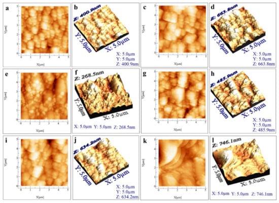 5 µm × 5 µm 2D AFM micrographs obtained for the HA7 (a), HA8 (c), HA9 (e), HA10 (g), HA11 (i), and HA12 (k) samples and their respective 3D representations (b,d,f,h,j,l).