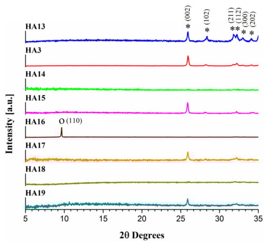 XRD patterns of the samples HA13, HA3, and HA14–HA19. Peaks marked with * belong to HA and the peak marked with O belong to OCP. ICDD file for HA: 01-084-1998 and ICDD file for OCP: 00-026-1056.