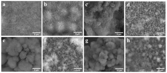 Along with the increase in deposition time, it appeared that the deposited layers underwent recrystallization and formation of a more uniform layer, without the crevasses observed in Figure 5a. The size of the clusters became smaller and their number increased, while acicular crystals grew and agglomerated.