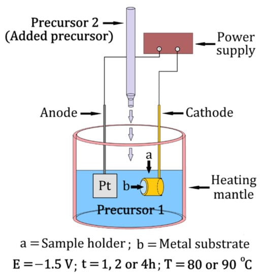 II. The deposition took place according to the novel method [] with 50 mL of one precursor present in the electrolyte solution and the other being added dropwise (under stirring) from a total volume of 50 mL, simultaneously with the application of a −1.5 V potential (Scheme 1). The potential value and the thermostat temperature (of 80 or 90 °C) were kept constant throughout the experiment.