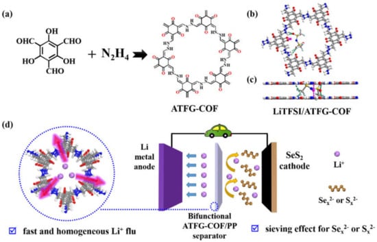 Covalent organic framework (COF) materials are a new type of porous crystalline material, which offer the advantages of stable pore structure and abundant functional groups [,,,]. Due to the diversity of organically linked units (ligands), the pores of these porous materials have strong chemical modifiability, size, and structure, and adjustable characteristics. Composite materials based on COFs show excellent performance in the field of electrochemical energy storage [,,,,]. Through the design of organic linkage units, the pore size and environment of COFs can be adjusted at the molecular level, so as to obtain COFs with screening effect for polysulfides/polyselenides and prevent them from diffusing to the lithium anode. Additionally, polar atoms or groups in the channels have certain adsorption effects on lithium ions, which makes it easier to reduce the concentration gradient caused by the diffusion rate and, consequently, to reduce the possibility of the formation of lithium dendrite.