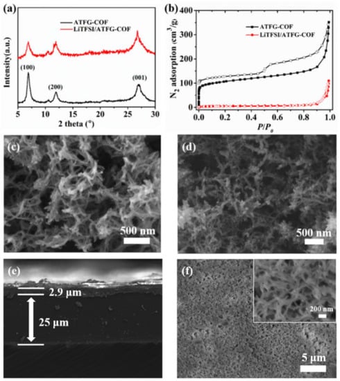 As shown in Figure 1a, ATFG-COF is a COF linked by the imine bonds formed by the reaction of 2,4,6-trihydroxy-1,3,5-benzotriformaldehyde and hydrazine hydrate through a Schiff base. It can be seen from the XRD patterns that the diffraction peaks at 6.9°, 11.8°, and 26.8° corresponded to the crystal planes of (100), (200), and (001) respectively, which is consistent with the reports in previous research (Figure 2a) []. The BET test showed that the specific surface area of the ATFG-COF was 383.37 m2/g (Figure 2b) []. The SEM image in Figure 2c shows that the synthesized ATFG-COF is a fibrous material with a diameter of tens of nanometers and a length of several microns, which is similar to a previously reported morphology []. The DFT calculation showed that the carbonyl group of ATFG-COF can effectively adsorb lithium ions, and that TFSI− anions have good interactions with ATFG-COF through hydrogen bonds; therefore, fibrous ATFG-COFs can adsorb LiTFSI (Figure 1b). In order to verify these results, we soaked the ATFG-COF in the solvent of LiTFSI to prepare the LiTFSI/ATFG-COF complex and conduct related characterization. As shown in Figure 2a, even after the adsorption of LiTFSI, the LiTFSI/ATFG-COF still maintained a good crystal shape. The BET test showed that the nitrogen adsorption capacity of LITFSI/ATFG-COF decreased sharply compared with that of the ATFG-COFs with the specific surface area of 5.42 m2/g, indicating that the channel was occupied by the LITFSI (Figure 2b). The SEM showed that the adsorbed LiTFSI/ATFG-COFs still maintained its fibrous structure (Figure 2d).