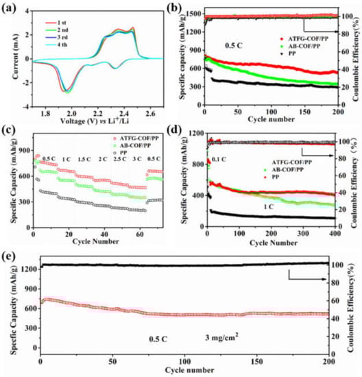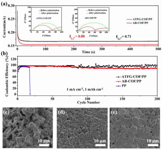 To confirm that ATFG-COF fiber coating can effectively promote the transport of lithium ions, the separators of ATFG-COF/PP and AB-COF/PP were assembled into a Li-Li symmetric battery, and the lithium-ion transport number was measured. As shown in Figure 3a, the lithium-ion transport number of the ATFG-COF/PP separator was 0.80, while that of the AB-COF/PP separator was 0.71, which were both higher than that of the ordinary PP separator. This is because porous COF can adsorb LiTFSI, thus increasing the transport number of lithium ions. Compared with AB-COF fiber, ATFG-COF fiber has abundant carbonyl groups and amino groups. On the one hand, carbonyl groups can effectively transfer lithium ions; amino groups can form hydrogen bonds with TFSI− to fix TFSI− in the channel, thus further promoting the transport of lithium ions. Compared with the separator with functional coating, the ATFG-COF/PP also showed a high level of lithium-ion transport [].