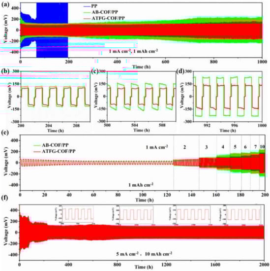 (a) Li-Li symmetric batteries with ATFG-COF/PP, AB-COF/PP, and PP at 1 mAh cm−2 and 1 mA cm−2; (b–d) amplifying the voltage platform in different cycles; (e) Li-Li symmetric batteries with ATFG-COF/PP, AB-COF/PP and PP at 1 mAh cm−2 and different current densities; (f) Li-Li symmetric batteries with ATFG-COF/PP at 10 mAh cm−2 and 5 mA cm−2.