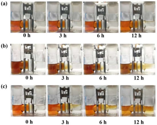 The sieving effect experiment: H-tube permeation test with different separators: (a) ATFG-COF/PP, (b) AB-COF/PP, and (c) PP.
