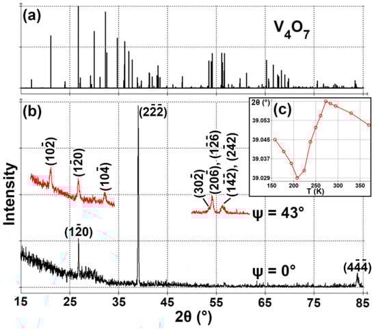 XRD pattern for a powder V4O7 sample was calculated based on the crystal structure from ref. [5] using Profex software [15] (Figure 1a). Our V4O7 film (Figure 1b) is highly textured, and the only strong peak is located at 2θ = 39.04°. The nearest reflection for the bulk sample is () at 2θ = 38.86°, so the compressive stress in the film is about 0.4%. A () reflection may be rewritten in rutile VO2 (R) subcell coordinates as (200)R [5]. Such texturing is typical for VO2 films [16,17], including samples produced by arc sputtering [18].