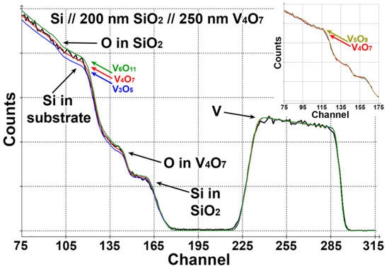 The formation of V4O7 is further confirmed by elemental analysis performed by RBS (Figure 2). An experimental spectrum was fitted, suggesting structures with different values of x in the VOx layer. The number of incident particles was adjusted to minimize the quadratic deviation for the signal from vanadium (channels 245–280). Then, the value of the reduced quadratic deviation was analyzed for the oxygen region (channels 75–115). The film composition of V4O7 gives the best agreement between experiment and simulation ( = 1.4). The accuracy of the method rules out the formation of V3O5 or Magnéli phases with n ≥ 6 ( = 8.6 and 5.3 for V3O5 and V6O11, respectively). However, it would be challenging to distinguish between V4O7 and V5O9, since V5O9 also gives an acceptable agreement between experiment and simulation ( = 2.3).