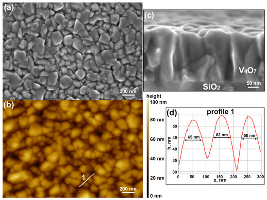 Morphology of V4O7 film was investigated using SEM and AFM (Figure 3). From the Scherrer equation (FWHM of () peak is 0.15°), we can estimate the average crystallite size as 60 nm. This value is consistent with visible grain sizes (Figure 3a,b,d). Additionally, using a watershed algorithm, we determined that the distribution of equivalent disk diameter for grains has a maximum of 60 nm and a mean value of 100 nm. From the cross-section image (Figure 3c), we can estimate the film thickness as 240 nm, which is in good agreement with the value obtained by RBS.