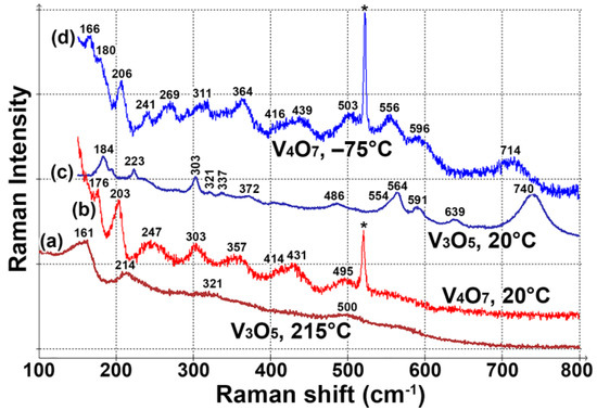 Raman spectrum of V4O7 film is shown in Figure 4. The spectrum is similar to one observed in our previous work (VOx, Figure 12 in ref. [6]). However, this VOx phase was not properly identified, and the sample contained impurities. V4O7 undergoes a phase transition between −36 and −23 °C, so two different spectra are presented: above (20 °C, Figure 4b) and below (−75 °C, Figure 4d) the phase transition temperature. Cooling the V4O7 sample leads to a blueshift of all Raman bands. Moreover, low-temperature modification has four additional peaks at 166, 556, 596 and 714 cm−1. Such spectral changes can be compared with the behavior of another Magnéli phase, V3O5 (Figure 4a,c). Similarly to V4O7, heating of V3O5 above the phase transition leads to the disappearance of strong peaks at higher wavenumbers: 564, 591 and 740 cm−1.