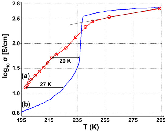 Temperature dependence of the V4O7 film electrical conductivity is given in Figure 6. Similar to XRD, we can see a broad transition region between −25 and −55 °C. The absolute value of conductivity at room temperature agrees well with the value previously reported for the bulk crystal [4]. For the low-temperature region, our curve is shifted by 20–25 K. Such shift is consistent with our observations derived from Raman spectroscopy.