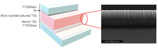A schematic design of a solar cell is displayed in Figure 1. The thick nanostructured TiO2 coatings grown on the FTO/glass covered with dense TiO2 (Figure 1) were photosensitized with N719 (Ruthenium 535-bisTBA) dye, and cis-diisothiocyanato-bis(2,20-bipyridyl-4,40-carboxylato) ruthenium (II) bis(tetrabutylammonium) [37] (Solaronix, Aubonne, Switzerland), at 0.2 mM in absolute ethanol, by soaking at 80 °C for 2 h. The plate was next rinsed with absolute ethanol to remove the excess dye and was dried at 80 °C for 10 min [5]. Our preference for this dye is based on the general appreciation that this is the most optimized, friendly with medium and easy available on the market, with respect to all the other equivalences from the same or similar classes [9].
