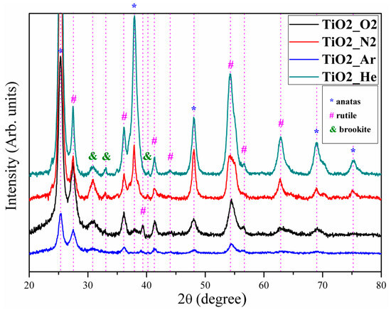 The XRD patterns reveal an increased crystallinity in the case of the TiO2_He sample, and a low crystallinity for TiO2_Ar, which is indicative of incomplete crystallization [52]. The absence of some diffraction maxima (37.9°, 62.8°, 68.9°, and 75.2°) is noticed for the TiO2_Ar coating.