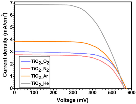 Current–voltage curves for typical dye-sensitized solar cells fabricated using photoelectrodes with various coatings: TiO2_O2 (blue line); TiO2_N2 (red line); TiO2_Ar (orange line); and TiO2_He (grey line). The measurements were carried out under standard AM 1.5G illumination conditions.