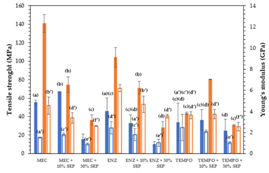 Mechanical properties of the films prepared by solvent casting (blue bars) and by filtration + hot pressing (orange bars). Tensile strength (full bars) and Young’s modulus (empty bars). Same letter above the bars means no statistical difference (p < 0.05) between preparation methods (tensile strength: (a) to (d); Young’s modulus: (a’) to (f’).