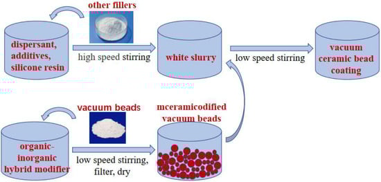 The preparation process of the vacuum ceramic microbead coating is shown in Figure 1. Firstly, titanium dioxide, mica powder and other fillers (15%) were added to epoxy silicone resin (60%), and stirred at the speed of 1500 r/min for 1 h, during the stirring process, dispersant (0.5%) and defoamer (0.5%) were added dropwise. After that, different contents of Mvcb (0, 10%, 20% and 30%) were added, and the vacuum ceramic bead coating was prepared after stirring them for 3 h at the speed of 800 r/min, during the stirring process, dispersant (0.5%) and defoamer (0.5%) were added dropwise.