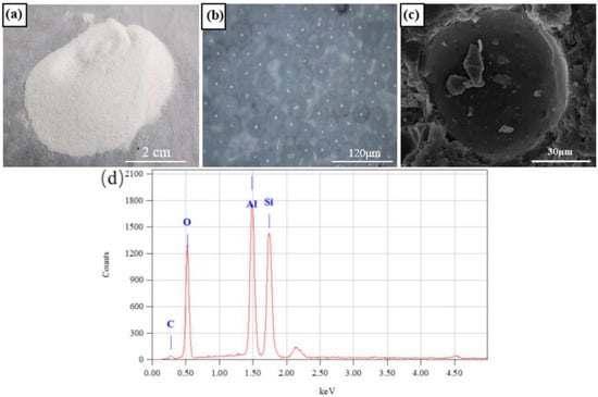 Morphology of vacuum ceramic beads: (a) macroscopic; (b) microscopic; (c) cross-section; (d) EDS analysis.