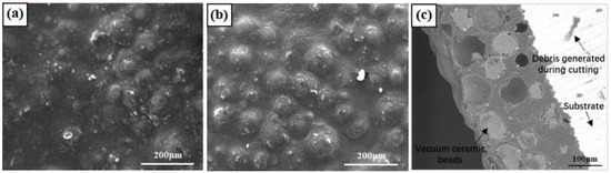 Micromorphology of vacuum ceramic microbead coating: (a) before modification; (b) after modification and; (c) cross-section morphology after modification.