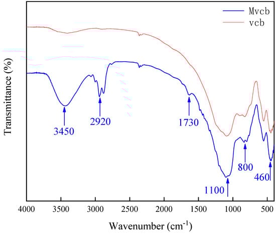 FT–IR analysis was performed on the vcb and Mvcb, as shown in Figure 4. It could be seen that the structure of the microbeads changed significantly after modification. 460 cm−1 was the bending vibration peak of Si–O–Si, 800 cm−1 and 1100 cm−1 were the symmetrical and asymmetric stretching vibration peaks of Si–O of SiO2 [], these groups indicated the main ingredient. The spectrum of Mvcb showed completely different results from vcb at 1730 cm−1, 2920 cm−1 and 3450 cm−1. Near 2920 cm−1 was the absorption peaks of –CH3 and–CH2 [], and 3450 cm−1 was the vibration absorption peak of –OH. The peak intensity increased significantly, and all of this indicated that the groups generated by the hydrolysis of the organic–inorganic hybrid agent were attached to the surface of vcb, and 1730 cm−1 was the characteristic absorption peak of the ester group []. The appearance of the ester group indicated that the part of the –OH produced by the hydrolysis of the organic–inorganic hybrid agent chemically reacts with the –OH on the surface of the vcb, which changed the surface structure of the vacuum ceramic microbeads. The groups on the surface of Mvcb, such as –OH, could react with –OH groups in epoxy silicone resin segments, which reduced the possibility of agglomeration of the microbeads and reduced the porosity in the resin, so that the microbeads could be well dispersed in the coating system and the coating has a dense structure.