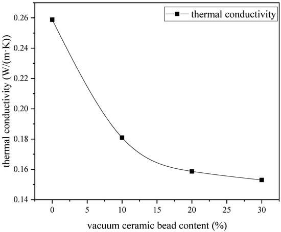 The vacuum structure of the microbeads could significantly reduce the thermal conductivity of the coating. The lower the thermal conductivity of the coating, the better its thermal insulation performance [], and the arrangement of vacuum ceramic microspheres was more conducive to improving the thermal insulation performance of the coating. The thermal conductivity of the vacuum ceramic microbead coating by adding different contents of Mvcb was measured, and the result is shown in Figure 5. It could be seen that the thermal conductivity decreased gradually with the addition of the Mvcb content. When the amount of Mvcb reached 20%, the thermal conductivity was significantly reduced, and the thermal conductivity of the coating film was almost the same as when it was 30%, indicating that the packing density of the microbeads at this time was relatively tight, and the heat transfer method between the film-forming substance and the microbeads was host. Too much content might lead the ceramic microbeads to squeeze and break each other and affected the performance of the coating. Therefore, the content of Mvcb in the coating was determined to be 20% when the thermal insulation coefficient showed little difference.