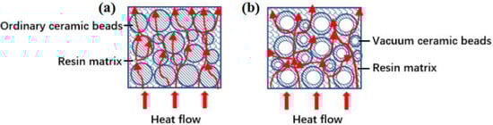 When the heat flow was transmitted inside the coating, it would propagate along the substrate with low thermal impedance. Different from the solid structure of ordinary ceramic microbeads, which could transfer heat flow, vacuum ceramic microbeads had a vacuum hollow structure, and there was no air inside to conduct heat, which had a great blocking effect on heat flow transmission [,], as shown in Figure 6b. Therefore, heat flow could only conduct along the outer wall of the vacuum ceramic microspheres and the resin matrix. Given that heat flux travels longer in the vacuum ceramic microbead coating than the ordinary one, the thermal insulation effect of the former was better than that of the latter. Moreover, within a certain range, the more vacuum ceramic beads were contained in the coating, the higher the packing density of the beads would be. This phenomenon increased the path of heat flow transmission and thermal impedance of the coating, and thus enhanced the heat insulation effect of the coating. However, with the further increase in the amount of vacuum ceramic beads, it was possible that the adhesion will decrease due to uneven dispersion or micro-defects in the coating. Therefore, the influence of ceramic beads on the mechanical properties of the coating needed to be balanced in the preparation of thermal insulation coatings.