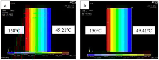 Finite element simulation results of the radial temperature distribution of the thermal pipe (a) without coating and (b) with coating.