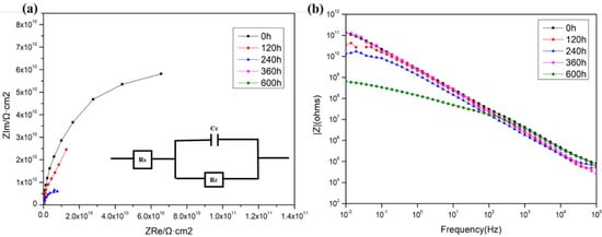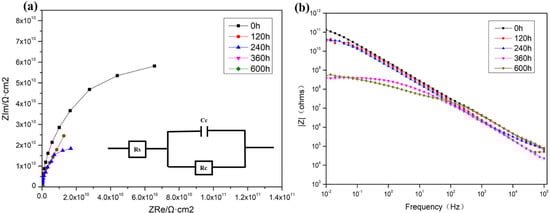 In order to further judge the heat resistance of the coating, the EIS test was carried out on the samples after the 200 °C heat aging test for 120 h, 240 h, 360 h, and 600 h, the test result was shown in Figure 10. It could be seen from the Nyquist diagram that the radius of the capacitive arc was continuously reduced during the entire aging process. The compactness of the coating to begin to decrease for the polymer chain of the coating bond was broken out at high temperatures [], but during the test, the capacitive arc always showed a time constant, indicating that the coating was still a complete dense layer at this time, and the corrosive medium had not penetrated into the substrate; in the Bode diagram, as the test progresses, the low frequency of the coating The impedance modulus value continues to decrease, especially after the aging test after 600 h; the low-frequency impedance modulus value dropped significantly, but it was still above 108 Ω·cm2, indicating that the coating still had good protective performance at this time and could effectively block external corrosion and hinder the corrosive medium which infiltrated into the surface between the matrix and the coating []. It could be that the coating had excellent protection nature and excellent heat resistance even at 200 °C from combining with the analysis of microscopic morphology and electrochemical performance.