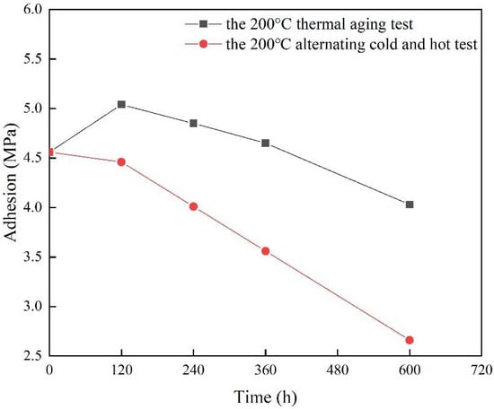 Adhesion reflected the interface between the coating and substrate, which was related to the protective effect and protective time of the coating []. The adhesion of the coating after the 200 °C thermal aging test and the 200 °C alternating cold and hot test was analyzed, as shown in Figure 13. It could be seen that the change of adhesion after the two tests showed different laws. Firstly, the initial adhesion data was 4.6 MPa, indicating good bonding and compatibility between coatings. Secondly, after the thermal aging test, the adhesion first increased and then decreased with the increase of aging time. The reason was that under the action of short-term high temperature, the crosslinking and curing of the polymer chain of the coating was further intensified, the bonding between coatings was increased, and the polymer chain was degraded with the further increase of aging time. The cohesion between coatings was affected under the action of high temperature for a long time so that the adhesion decreased gradually, but it remained at about 4 MPa after 600 h, indicating that the coating still had good interface bonding with the substrate at that time. The adhesion of the coating after the 200 °C cold and hot alternating test decreased with the increase of test time, which was quite different from that after the 200 °C thermal aging test. First, the huge temperature difference in the cold and heat alternating process made the coating heat unevenly and produced temperature strain, resulting in residual stress in the coating, which weakened the adhesion of the coating. Second, because the cooling condition was in the immersion environment, water molecules penetrated into the coating, further weakening the bonding between the coatings. However, in this harsh environment, the adhesion was still 2.6 MPa after 600 h, indicating a good interface between the coating and the substrate.