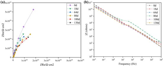 The sample was immersed in 3.5% NaCl solution, and the electrochemical behavior of the coating after immersion for 18 d, 64 d, 80 d, 100 d, and 130 d was followed to investigate the shielding ability of the coating to the medium. Figure 14 shows the EIS change of the coating during the immersion test. The Nyquist diagrams were all single-capacitive arcs with a large radius as the test is carried out, which was characterized by a time constant. However, as the immersion time increases, the radius of the arc was also decreasing, indicating that the charge transfer step after immersion for 130 d was a control step. Although water, oxygen and other corrosive media were constantly penetrating into the coating, which had not penetrated into the metal substrate, and the coating was still a complete shielding layer. The Bode diagram of the coating was always a straight line. Although the low-frequency impedance modulus was decreasing with the increase of time, the one of 130 d still remained above 1010 Ω·cm2, indicating that the coating structure was still dense after long-term immersion, which had a strong shielding ability to the corrosive medium [].