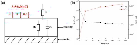 The electrochemical impedance spectroscopy data was fitted with an equivalent circuit to further analyze the changes of the coating during the immersion test []. The equivalent circuit of the heat-insulating anti-corrosion coating during the immersion process is shown in Figure 15a. Rs was defined as the solution resistance, Rc was defined as the coating resistance, and Cc represented the coating capacitance. Both Rc and Cc reflected the impermeability of the coating, and the fitting results of the two are shown in Figure 15b. It could be seen that with the increase of the test time, Rc was continuously decreasing, indicating that the protective ability of the coating was continuously weakening, but still remained at a higher order of magnitude; Cc was generally increasing, indicating that water molecules continuously penetrated into the coating in the test, and the high dielectric constant of water caused the overall capacitance value of the coating to increase []. However, the change rate of Rc and Cc was slower because the diffusion and penetration of water were restricted, which reflected the good shielding ability and anti-corrosion performance of the coating.