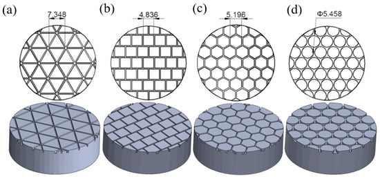 The schematic diagram of the specimens with four types of cross-grooved texture shapes: (a) triangle-textured specimen; (b) square-textured specimen; (c) hexagon-textured specimen; and (d) round-textured specimen.