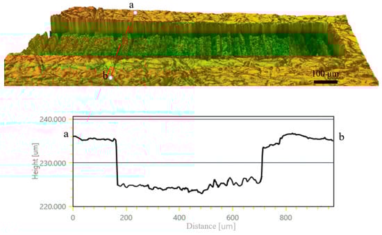 The schematic diagram of the specimen is shown in Figure 1. In order to explore the effect of cross-grooved texture shapes on the lubricated characteristics, all the areas of simple shapes were the same and the groove width was 0.5 mm. The specimens were replicated. The micrographs of the textured groove were obtained by the principles of White Light Interferometry, and the groove depth was measured to be 10 μm, as shown in Figure 2. For a better comparison, the preparation process of the non-textured specimen was the same, only without laser processing. Before each test, the specimens and counter-disks were cleaned with a mixture of acetone (5%) and ethanol (95%) in an ultrasonic apparatus.