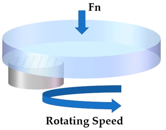 The friction tests under lubrication were implemented at ambient temperature and humidity (around 28 °C and 30% RH) with a tribo-testing machine (M2000, Hebei Testing Machine Co. Ltd., Hebei, China) using a disc-on-pin setup shown in Figure 3. The upper was the counter-discs, and the lower was the tested specimen, the lubrication of which could flow through the grooves. A commercial diesel (0#) with a viscosity (η) of 0.0027 Pa·s was selected as the lubricant, and 0.6 mL of lubricant was applied in each test. The tests were conducted under a series of loads (20, 50, 70, and 100 N) and rotating speeds (50, 100, 200, and 250 rpm). The testing period was 60 min, after which the friction coefficient was recorded. Five specimens were repeated for each condition to reduce test errors.