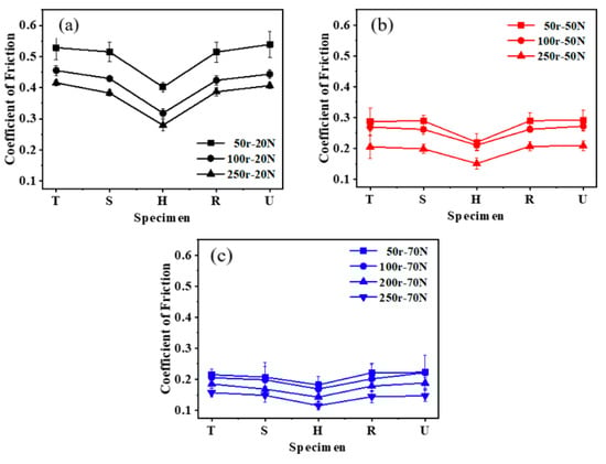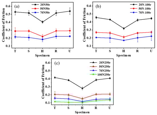 The average friction coefficients of four cross-grooved texture shapes under the rotating speeds of (a) 50 r, (b) 100 r, and (c) 250 r. T (triangular); S (square); H (hexagonal); R (round); and U (untextured).