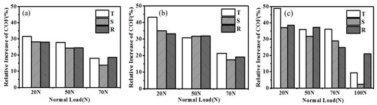 The influence of the other three textured specimens on the relative increases of COF compared with that of hexagon-textured specimens under different loads: (a) 20 N; (b) 50 N; (a) 70 N.