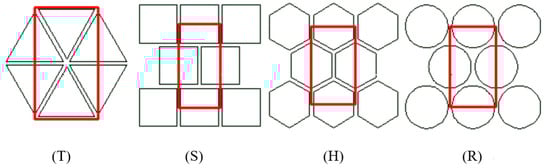 The simulation units of four cross-grooved texture: (T) triangle-textured; (S) square-textured; (H) hexagon-textured; (R) round-textured.