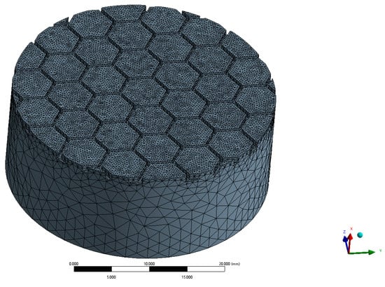 The simulation experiment in this part was completed in ANSYS Workbench. Apply a series of loads (20, 50, 70, and 100 N) to the textured surface. The mesh was generated by tetrahedral elements, the element size was 3 mm. The mesh on the surface of the tested specimen was refined with an element size of 0.2 mm. Figure 9 shows the meshed hexagonal texture specimen. Other options used default values. By applying the analysis over the texture surface under load, we obtained the stress distribution numerically. Figure 10 shows the simulation results of the equivalent stress on the surface of each texture-unit. It can be seen that the hexagonal-unit exhibits uniform stress distribution and less equivalent stress than other textured-units, except for the triangle-unit. We should note that the maximum equivalent stress of hexagonal-unit was nearly equal to that of the triangle-unit (3.7752 and 3.5441, respectively), but the area of the triangle-unit was twice that of the hexagonal-unit. However, the edge loading makes peak values potentially misleading. Overall, the equivalent stress was concentrated at the edge, especially the round-unit. It can be seen from the round-unit that the equivalent stress in a fair portion of the region (dark blue) was almost zero, which caused the greater stress at the edge.