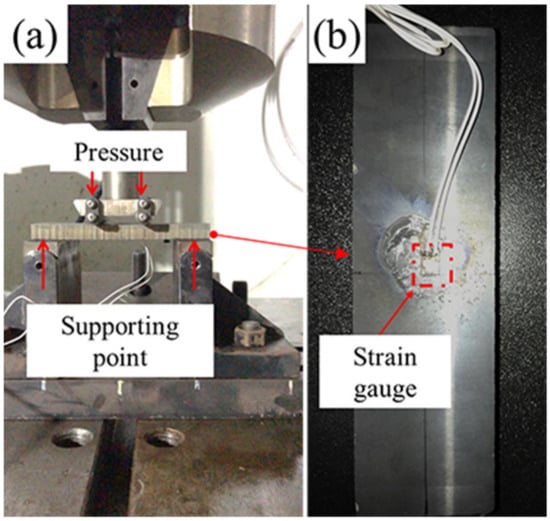 In order to study the fatigue behavior of the sample with various coatings, the bending fatigue tests (BFT) were executed by a fatigue test system (MTS Flex Test60, MTS, Eden Prairie, MN, USA), dynamic servo control system (Dyna 900 DTB-S, Dailong, Hangzhou, China) and self-made four-point fatigue bending test unit (as shown in Figure 2a). The distance between the support points was 90 mm and the stress ratio was 0.1. According to the Det Norske Veritas (DNV) test standard, the test loading was determined to be 90% of theoretical yield strength of the substrate and the frequency was ranged of 0.25–1 Hz. As shown in Figure 2b, a strain gauge was glued on the surface. A dynamic signal test and analysis system (DH5922D, Donghua tester, Taizhou, China) was used to measure bending stress of the tested coating in real time. For accuracy of the experiment, three repetitive tests were performed for each group of samples. During the experiment, the testing process was interrupted to detect situation of surface crack every 500 cycles until to 2000 cycles. Once the visible fatigue crack was occurred, the experiment was terminated.