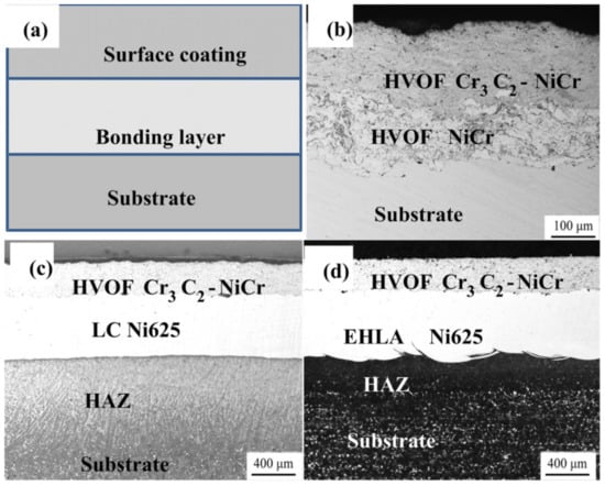(a) The sketch of the complex coating; (b–d) presents the cross section of Cr3C2–NiCr + NiCr, Cr3C2–NiCr + LC Ni625 and Cr3C2–NiCr + EHLA Ni625.