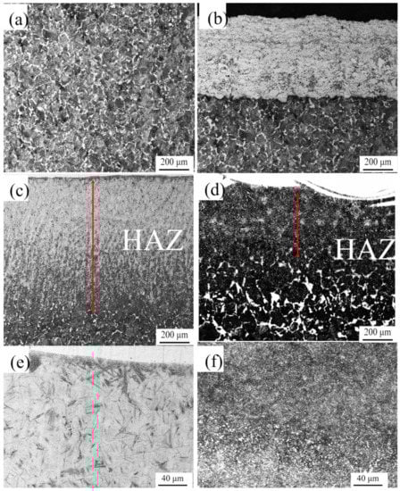 (a) the microstructure of substrate; (b–d) the cross section of No. 1–3; (e) and (f) present the HAZ details of the LC Ni625 and EHLA Ni625 layer.
