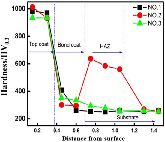 After surface treatment, the prepared coatings underwent grinding until the roughness reaching Ra 0.4 μm to reduce machining tool marks. For microstructure analysis, standard methods of metallography were carried out. The aqua regia (3:1, v/v, HCl to HNO3) was used as a corrosive liquid due to high corrosion resistance of the prepared layers. Microstructures of the bonding layer and the surface coating were characterized by an inverted metallographic microscope (DMI5000M, Leica, München, Germany). According to metallographic method, the porosity of HVOF coating was analyzed. Surface hardness was measured by a Vickers hardness tester (model 5104, Buehler Co., Ltd., Sacramento, CA, USA) with a load of 300 g and a dwell time of 15 s. To ensure the accurate of the microhardness, three repetitive tests were executed for each location. Moreover, eight indentations, spaced 0.15 mm apart, were performed at cross-sections of the coatings along the depth direction.