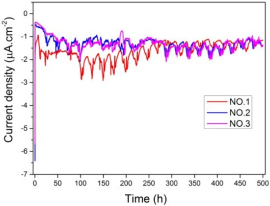 The electrochemical behavior of the coatings was investigated by measuring potentiostat polarization curves and EIS. Potentiodynamic polarization curves of samples No. 1, No. 2 and No. 3 coatings during 500 h of corrosion at −350 mV were tested, as shown in Figure 10. There were fluctuations in testing process of current density. The results indicated that final current density of samples No. 1–No. 3 ranged from −1.4 μA/cm2 to −1.2 μA/cm2. A negative net current showed a cathodic behavior of the coatings and no porosity and micro-cracks penetrating the coating down to the substrate. There was little difference in these three curves, meaning that the corrosion resistance of different coatings under the action of pure corrosion was close. The negative net current indicated the cathodic behaviors of the coatings.