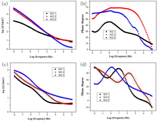 Bode plots recorded of the sample without BFT: (a) lg |Z|-lgf; (b) phase-lgf; Bode plots recorded of the sample after BFT: (c) lg|Z|-lgf (d) phase-lgf.