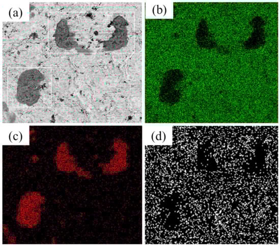 For sample No. 1 suffering the BFT, corrosive morphologies (Figure 13a) were demonstrated in the form of broken surface and formation of through-wall micro-cracks. To identify the corrosion products, EDS was operated on the surface. As the results shown (Figure 13b–d), there was almost 100% Fe element covering the severely corroded area (white rectangle in Figure 13a). This was caused by the fact that the substrate was directly exposed in the corrosive environment after BFT. The ferric oxide overflew though the perforative crack and distributed nearby the cracks. The corrosion behavior in other area was similar to the sample without BFT.