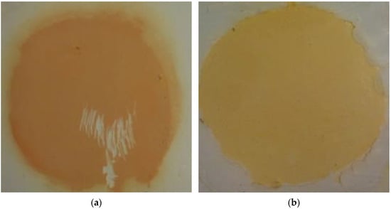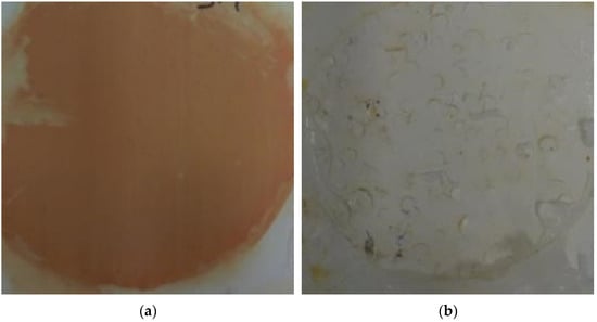 Figure 10a shows the surface of the NBR-CW sample in which only a colour change of the material occurred after exposure to 30% HCl for 90 days. After scratching the surface, it was possible to easily remove the coloured layer, by which it was found that the colouring is only superficial and does not go through the whole layer of the surface.