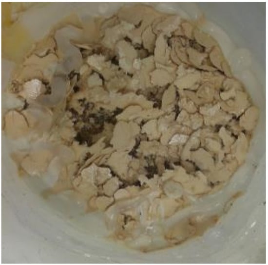 Figure 11) was classified by the value of 5—total collapse of the system. This was due to the complete degradation of the tested layer of the coating throughout its thickness.