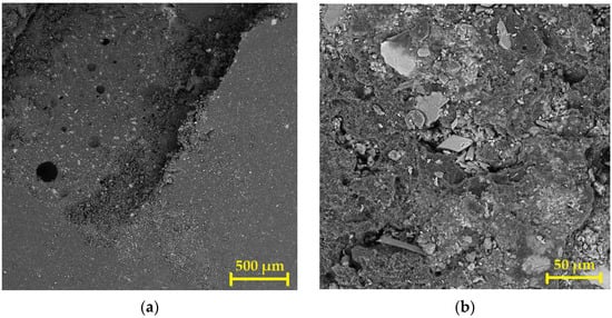 Figure 12a shows the structure of the 120-day-old material without exposure to chemicals. The structure has a solid, smooth surface at the fractured edge caused during sampling. It can also be seen that the filler is completely embedded in the polymer, and individual grains are fully coated in the polymer. The material showed no colour changes or disruptions on the surface. It is possible to see several air bubbles in the matrix, which were probably caused by the imperfect mixing of the material prior to its application. Tiny dust particles on the surface were caused by sampling—sample cut-off.