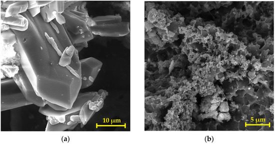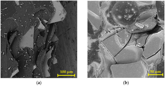 Figure 15a shows waste glass particles (shards) emerging from the polymer matrix, which has been severely disrupted after exposure to formic acid for 120 days. It is possible to observe the sharp edges of shards characteristic of this type of filler.