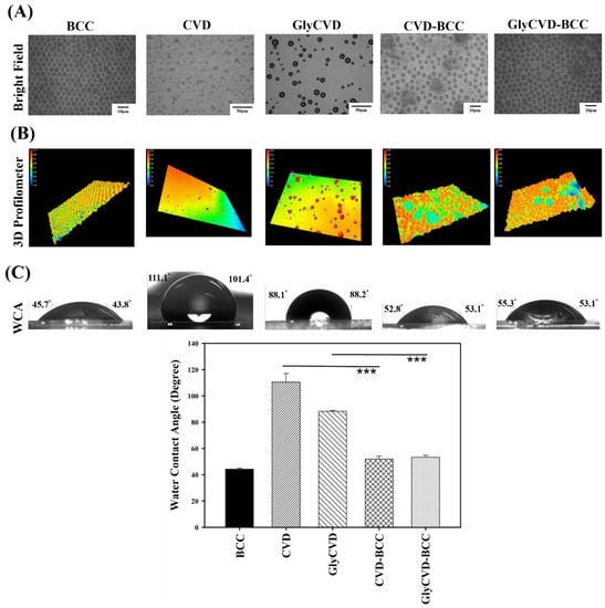 Surface characterization using (A) inverted microscope, (B) laser 3D profilometer, and (C) water contact angle analysis. Five types of structured surfaces were fabricated and characterized. BCC has close-packed structures while CVD and GlyCVD do not. The hybrid surfaces, CVD-BCC and GlyCVD-BCC, have close-packed and hierarchical structures. BCC is hydrophilic while CVD and GlyCVD are hydrophobic. Asterisks denote significant differences in the water contact angle (*** p < 0.001).
