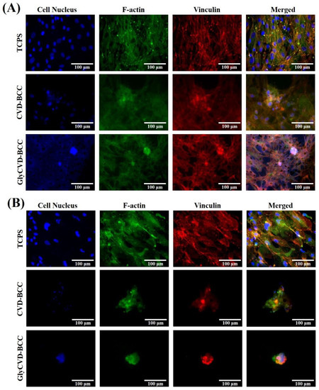 Representative images of cell morphology. The cell nucleus (DAPI), F-actin (Alex-488), and vinculin (phalloidin) of hBMSCs were immunostained after (A) 3 days and (B) 5 days. It should be noted that cell detachment was observed on the hybrid surfaces due to multiple rinses during staining.